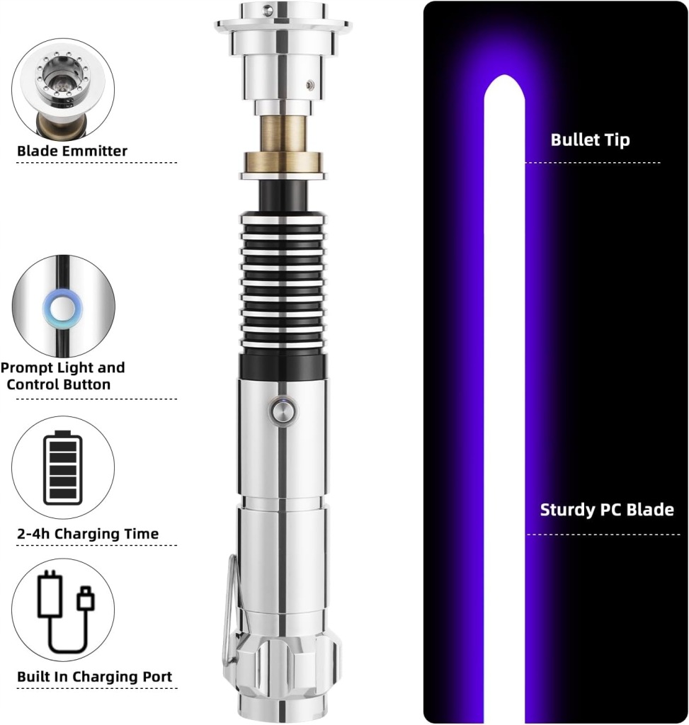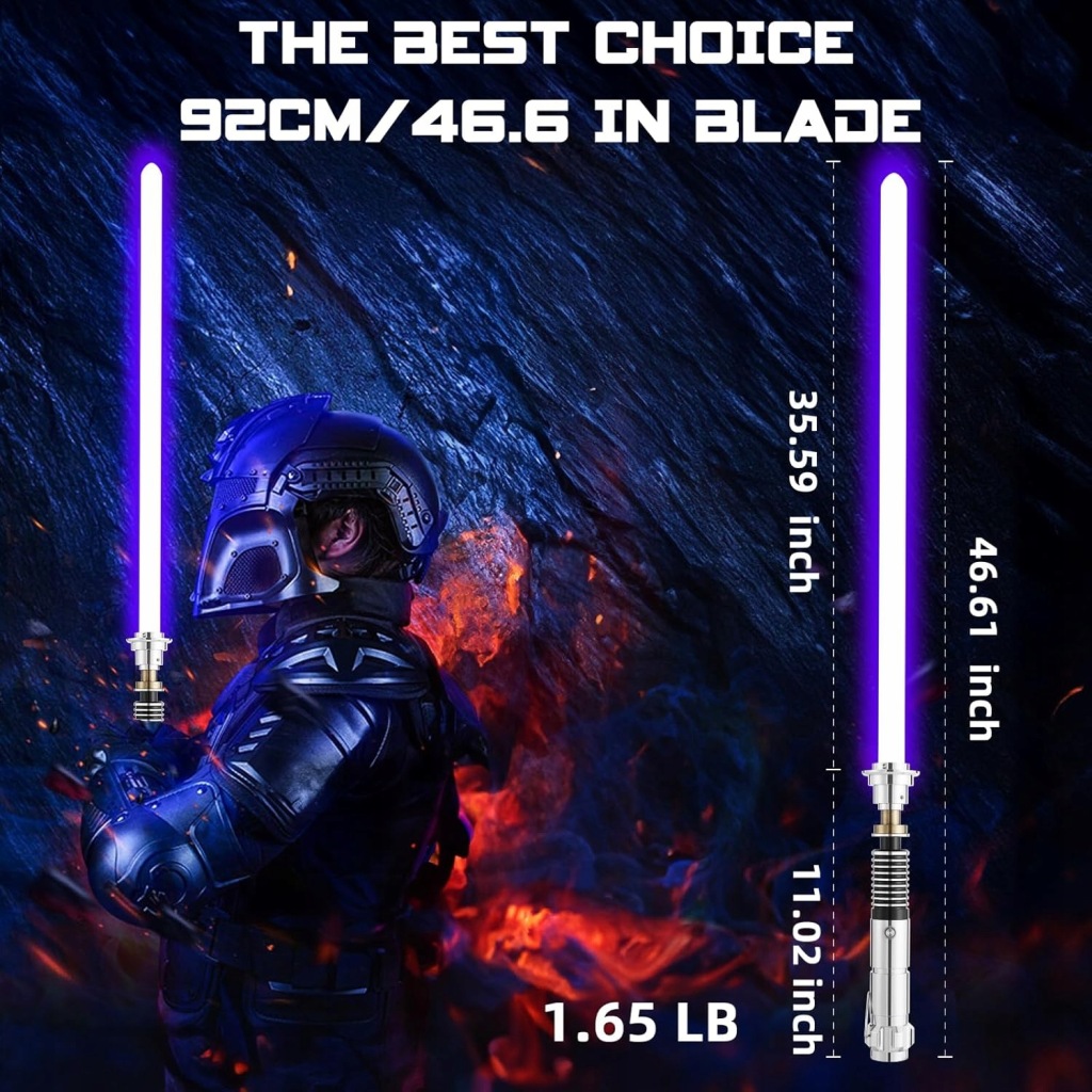 Rękojeść wykonana z aluminium jest trwała, dobrze wyważona i wygodna w trzymaniu. Ostrze z poliwęglanu cechuje się wysoką odpornością na uderzenia, co sprawia, że miecz świetlny doskonale nadaje się do dynamicznych pojedynków i długotrwałego użytkowania.