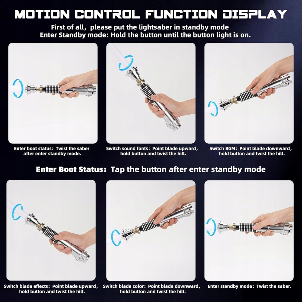 Inteligentne sterowanie ruchem umożliwia włączanie i wyłączanie miecza poprzez gest. Do wyboru są trzy tryby świecenia: stały, pulsujący oraz efekt zderzenia, które dodatkowo zwiększają realizm i pozwalają dopasować miecz do stylu walki.