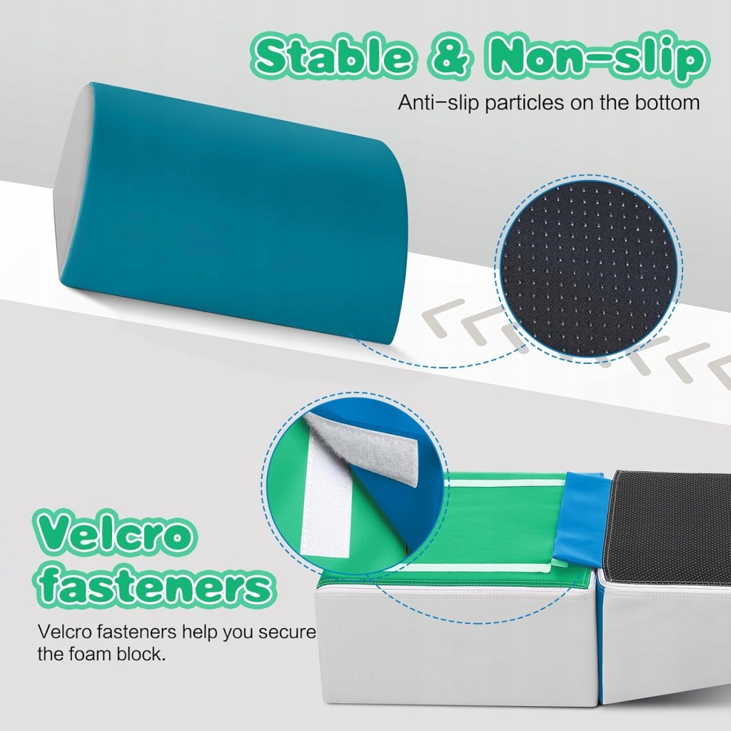 Klocki wykonano z wysokiej jakości, nietoksycznej pianki, która zapewnia odpowiednią stabilność i bezpieczeństwo podczas codziennego użytkowania. Miękka konstrukcja minimalizuje ryzyko urazów, dzięki czemu dzieci mogą swobodnie odkrywać nowe ruchy i ćwiczyć równowagę bez obaw.