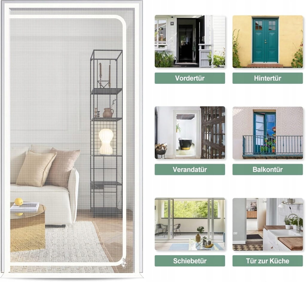 Instalacja jest bardzo prosta i nie wymaga narzędzi. Wystarczy przykleić taśmę rzepową do futryny drzwi, a następnie zamocować moskitierę. Produkt pasuje do wielu typów drzwi, takich jak drzwi balkonowe, tarasowe, przesuwne czy wejściowe.